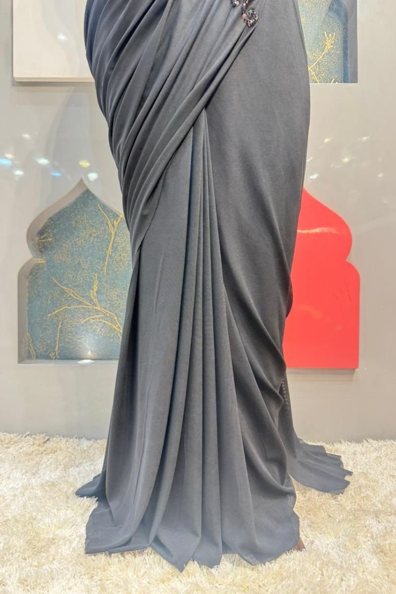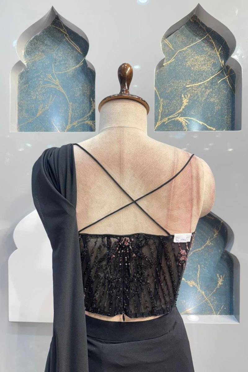 The pre-draped black saree flows effortlessly with soft, fluid pleats that sculpt the body beautifully. Highlighted with delicately embellished motifs at the waist, the drape blends modern sophistication with timeless glamour, making it perfect for cocktail evenings, receptions, and statement celebrations.