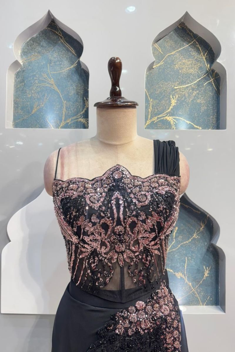 A stunning black blouse crafted with intricate rose-gold and antique sequin embroidery, designed in a corset-style silhouette for a structured and flattering fit. The sheer mesh base adds a touch of allure, while the asymmetric single-shoulder strap enhances its contemporary couture appeal.
