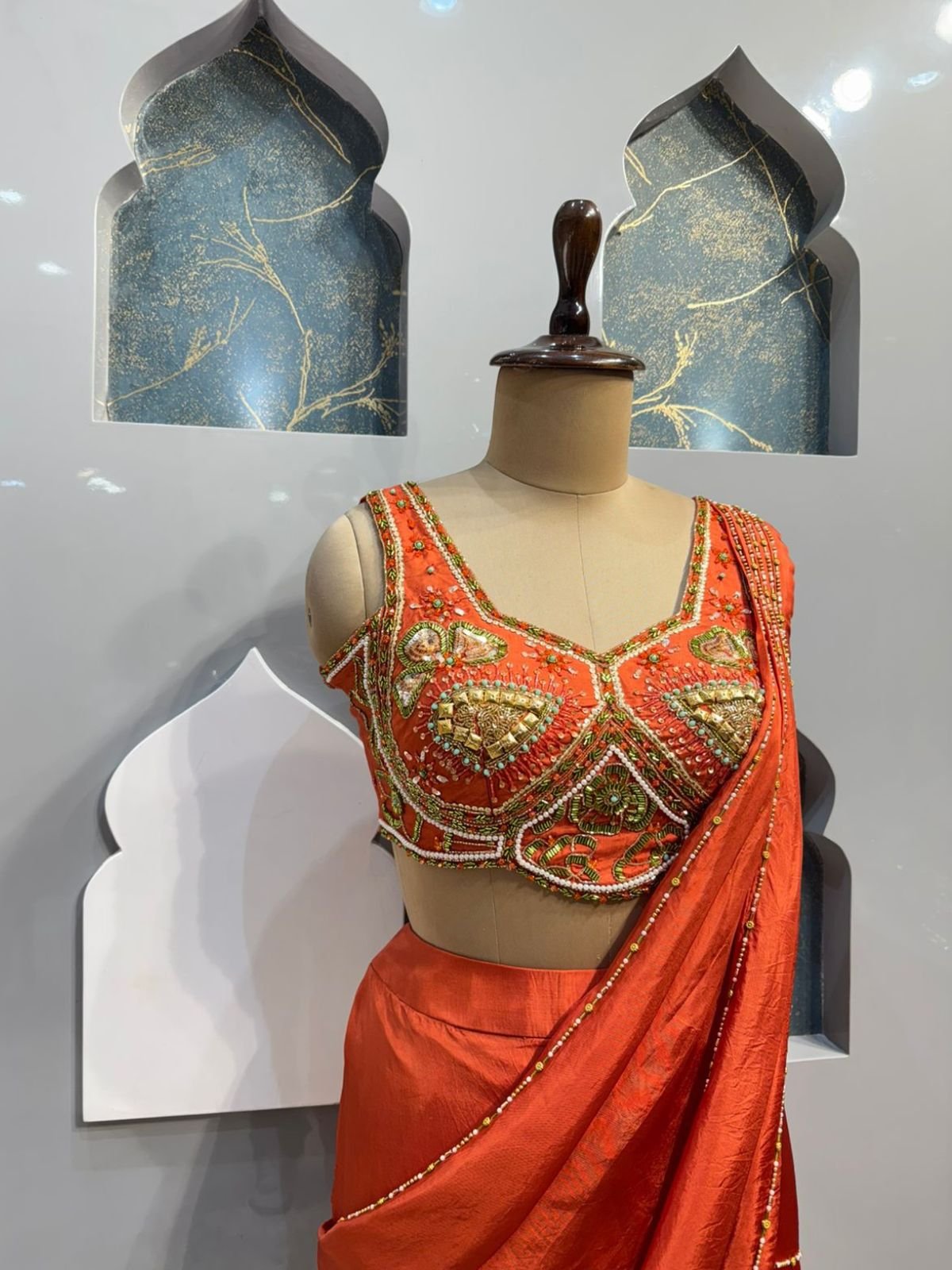 A stunning sleeveless blouse designed in a vibrant burnt orange shade, beautifully adorned with intricate hand embroidery, beads, and sequin embellishments. The structured neckline and detailed craftsmanship create a rich and festive look, adding elegance and glamour to the overall ensemble.