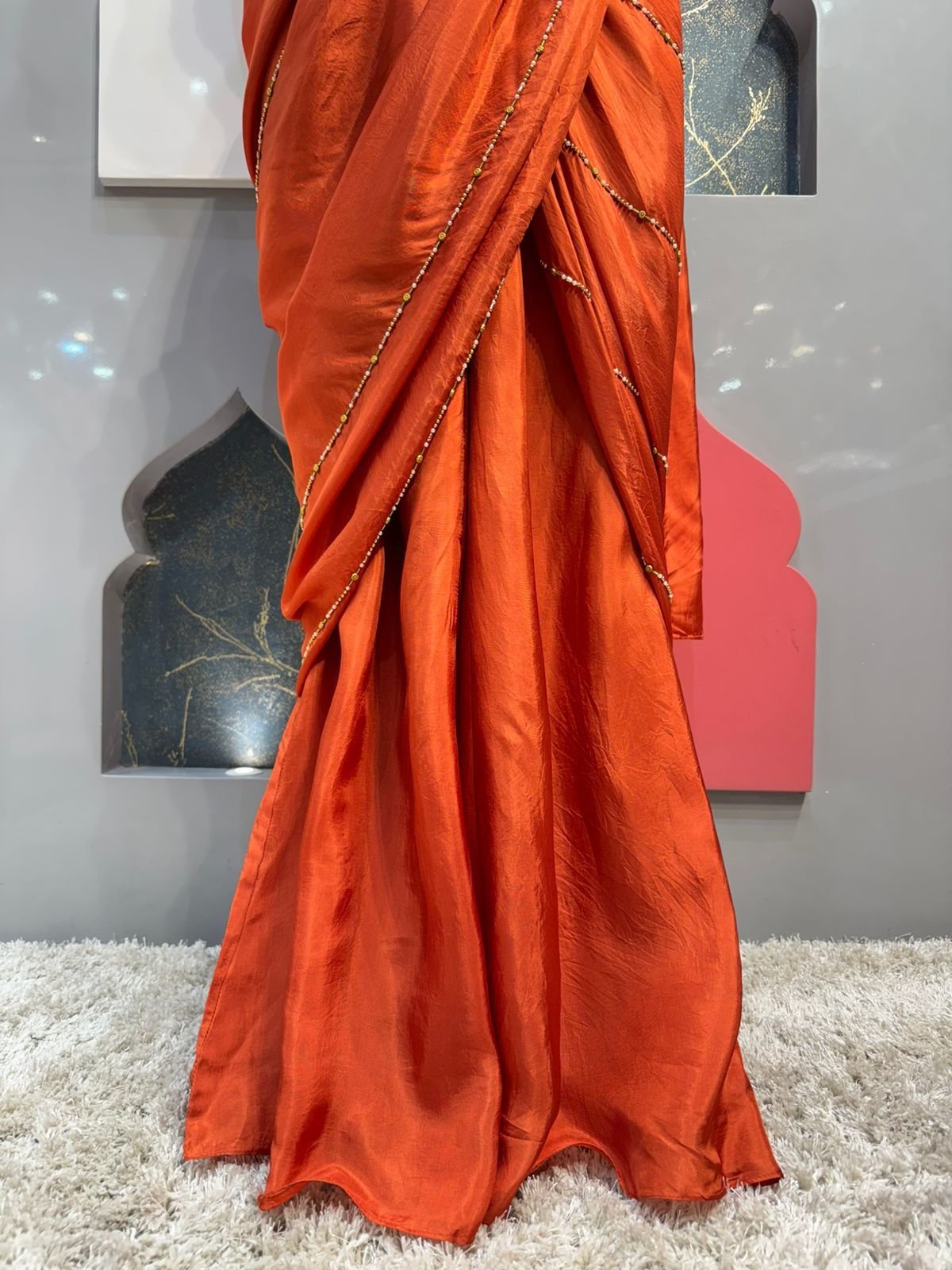 The pre-draped saree features a graceful silhouette in a matching burnt orange tone, designed with elegant pleats and soft draping that flows effortlessly. The subtle sheen of the fabric along with delicate border detailing enhances its sophisticated appeal, making it perfect for weddings, receptions, and festive celebrations.