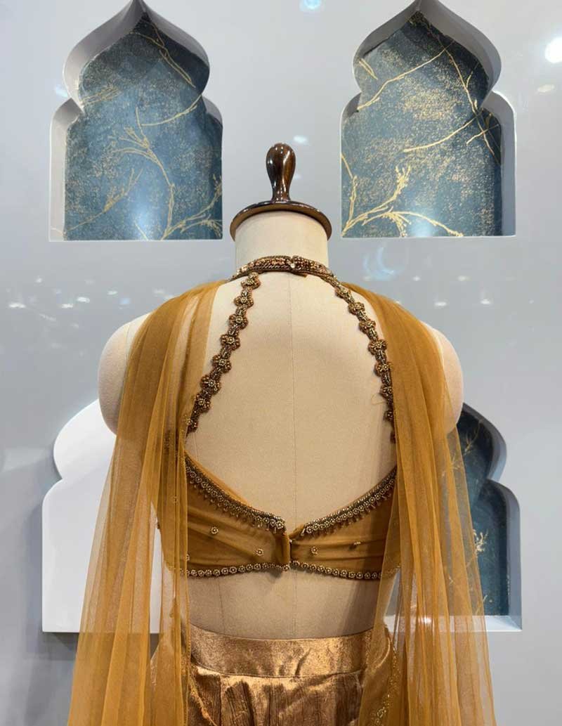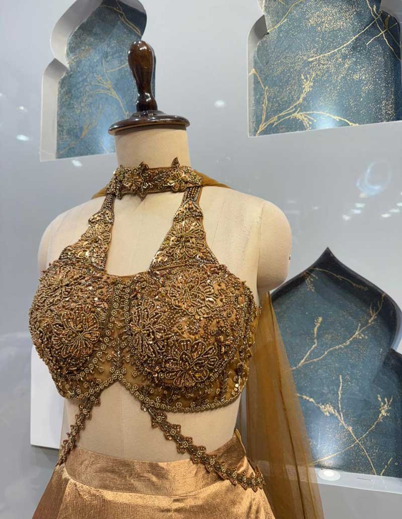Heavily hand-embroidered halter-neck blouse adorned with intricate antique gold detailing, featuring a structured silhouette and elegant tie-up neckline for a bold festive look.