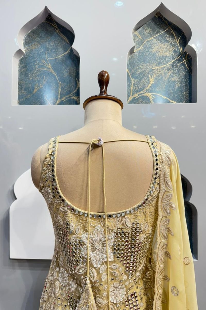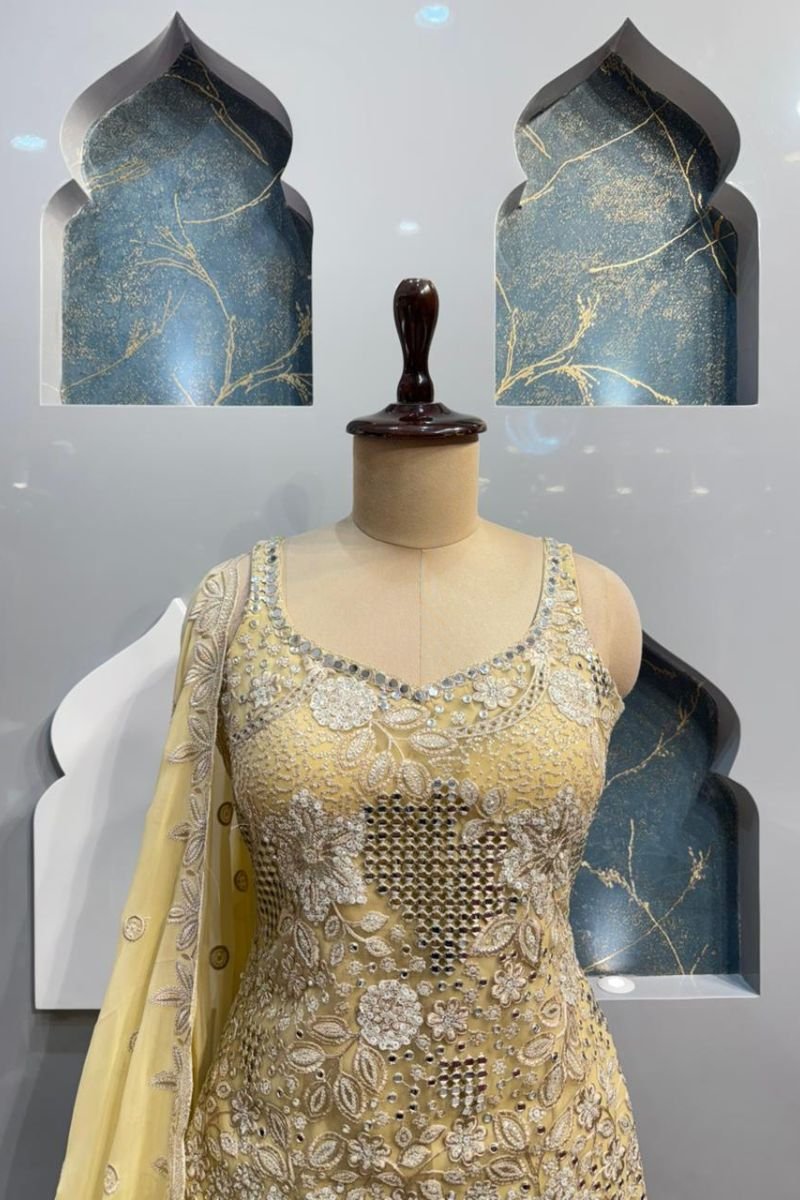 The dupatta is made from a lightweight, sheer fabric in a matching ivory-gold shade, embellished with delicate embroidered motifs and a finely finished border. Its soft drape and subtle shimmer add a touch of effortless elegance, completing the ensemble beautifully.