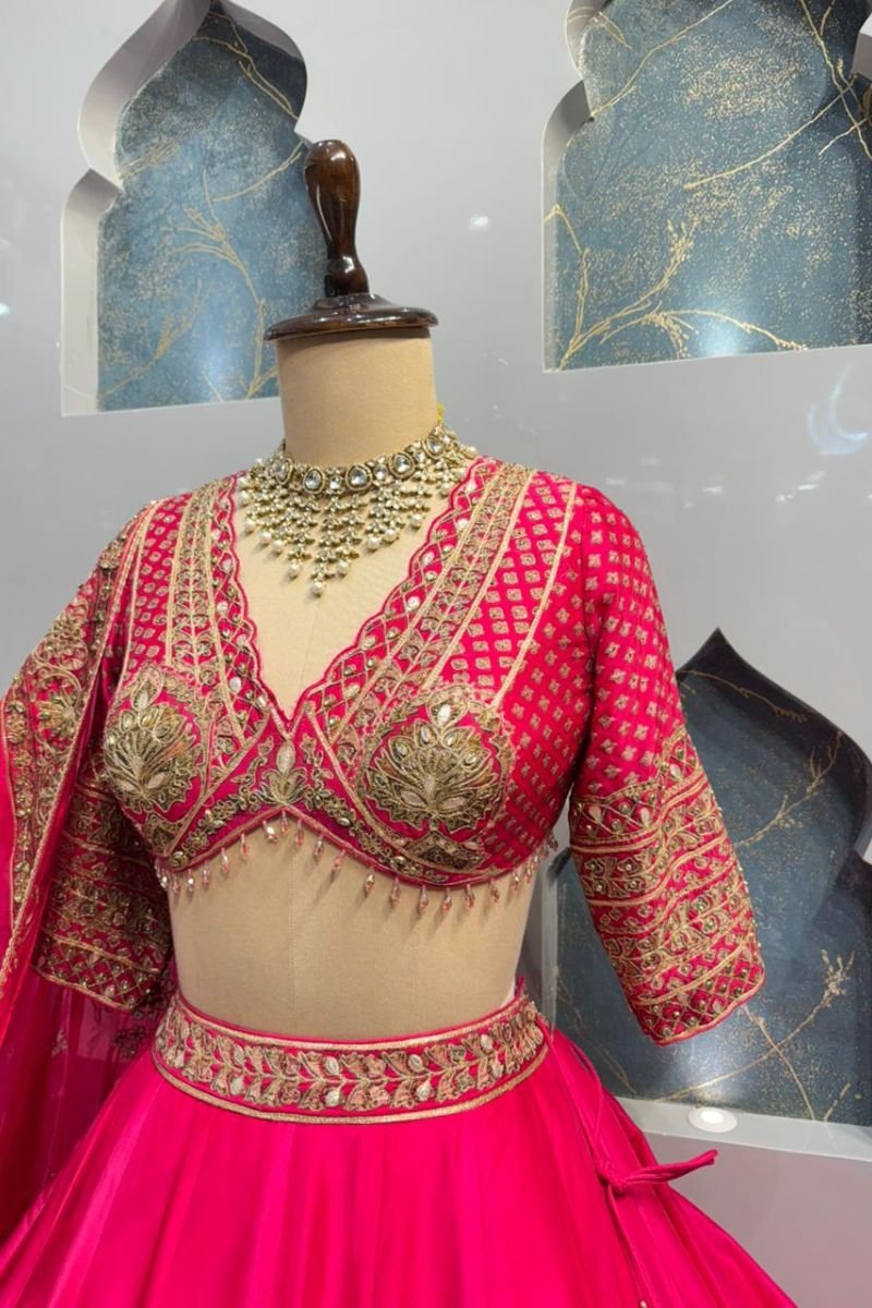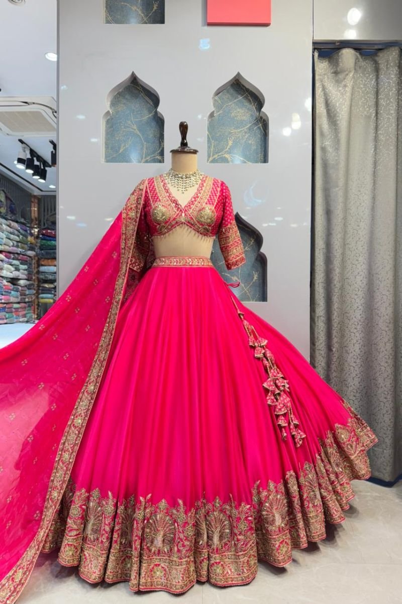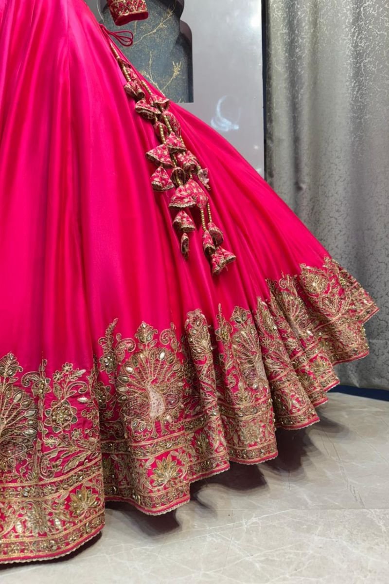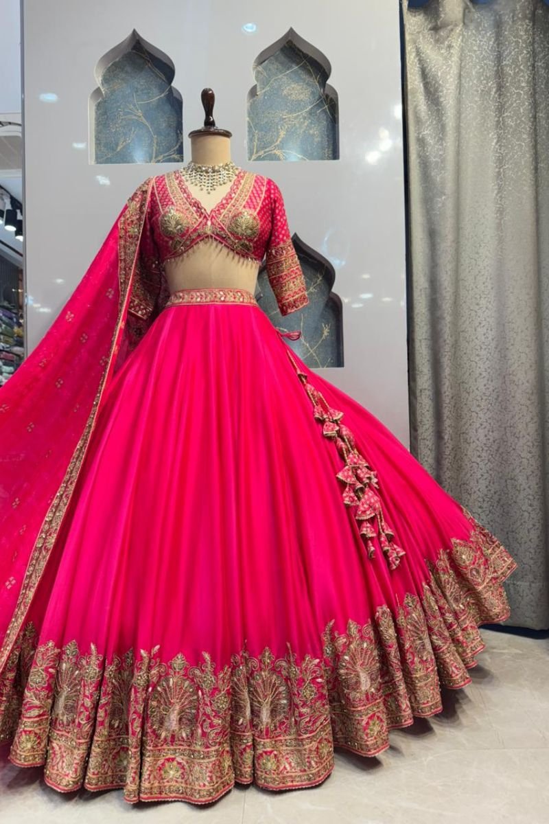 The lehenga flows beautifully in a vibrant pink hue, crafted in a soft, lightweight fabric that creates a graceful flare. Enhanced with an exquisitely embroidered gold border along the hem, it adds grandeur and movement, making it ideal for weddings and festive celebrations.