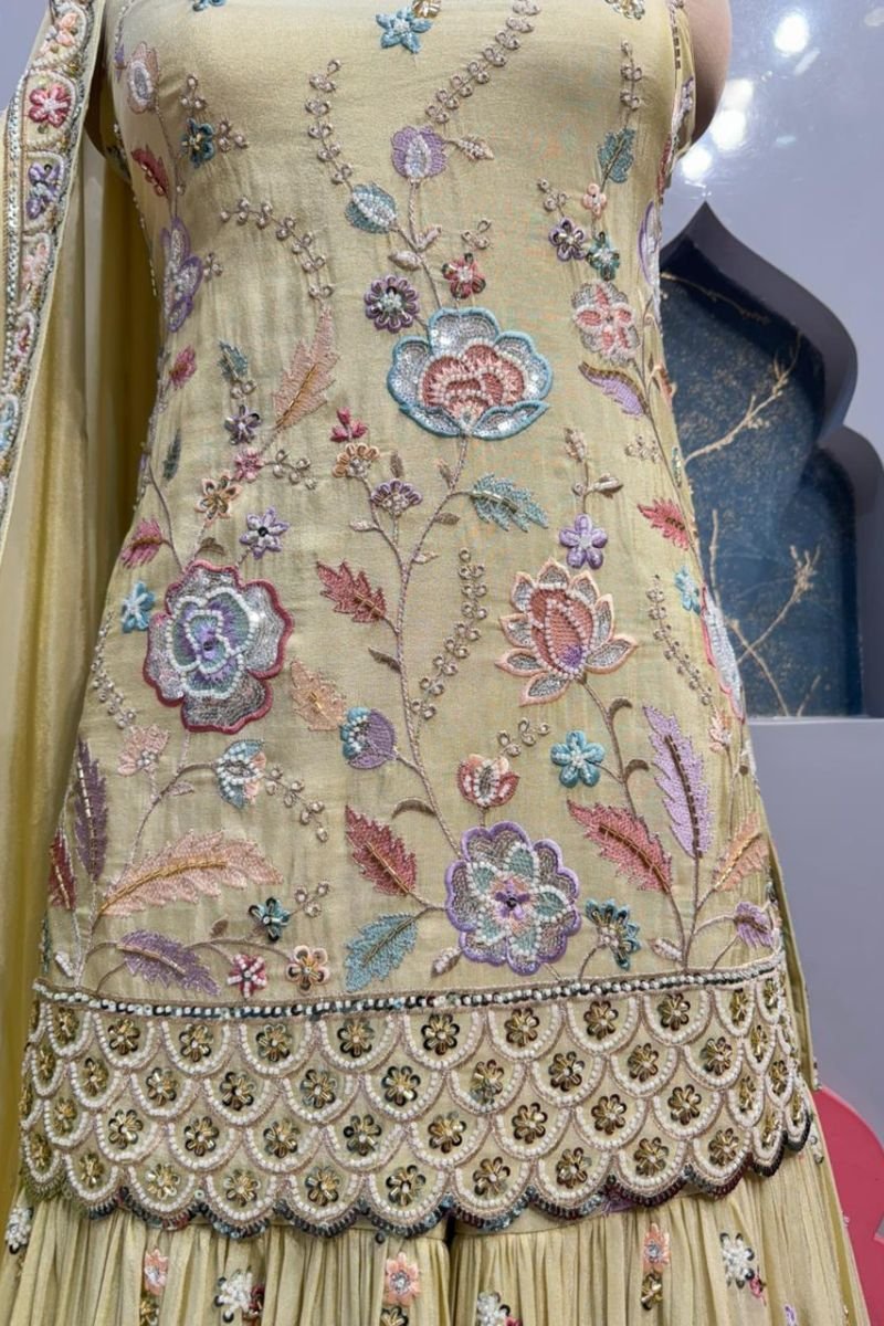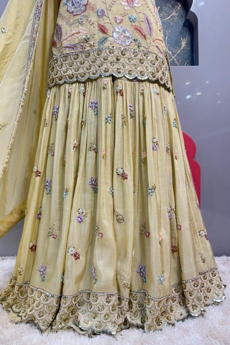Flowy ivory sharara featuring soft pleats that create graceful movement and a voluminous finish, adding a touch of effortless elegance to the ensemble.