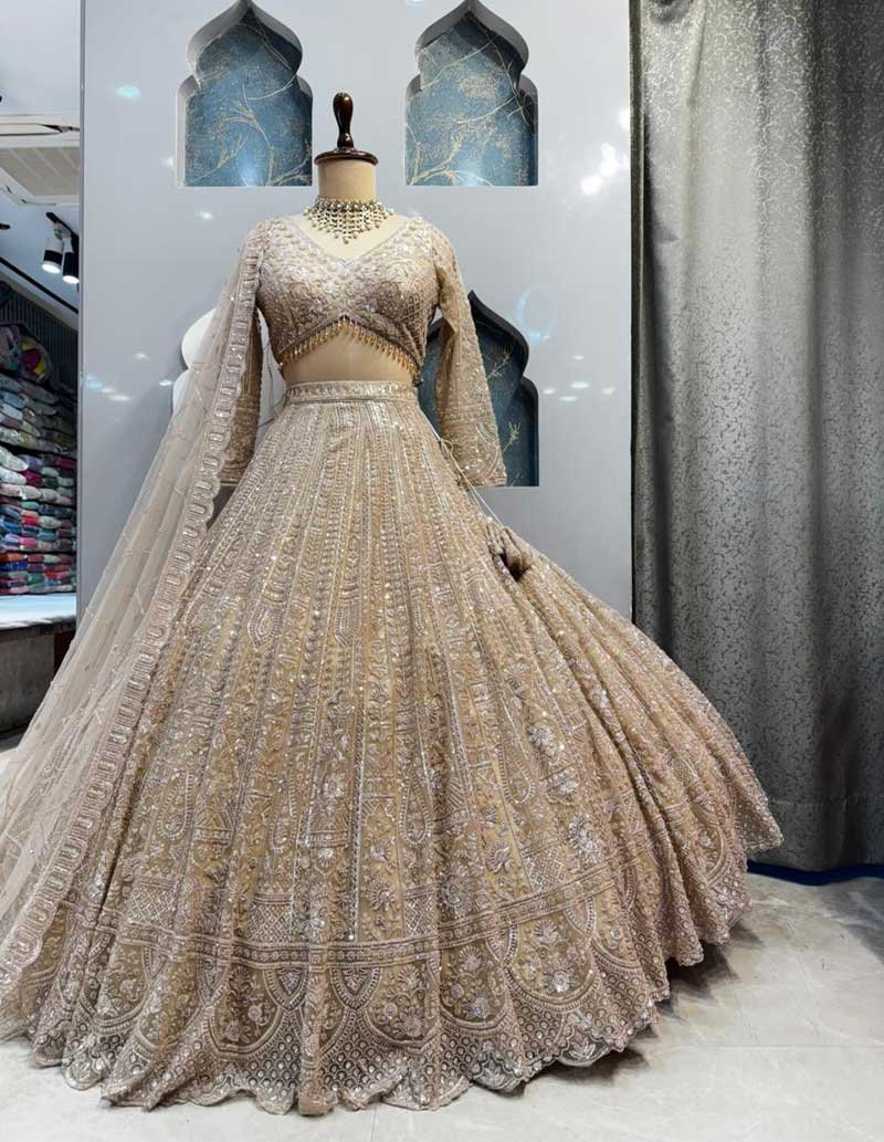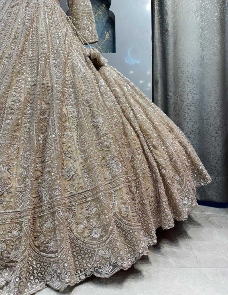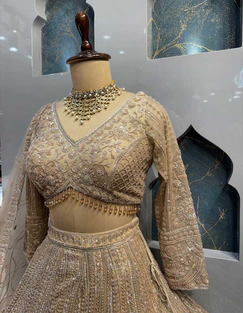 Graceful champagne-gold blouse intricately crafted with fine zari, sequin, and bead embroidery. Designed with a soft V-neckline and delicately embellished full sleeves, it offers a refined and timeless bridal appeal.