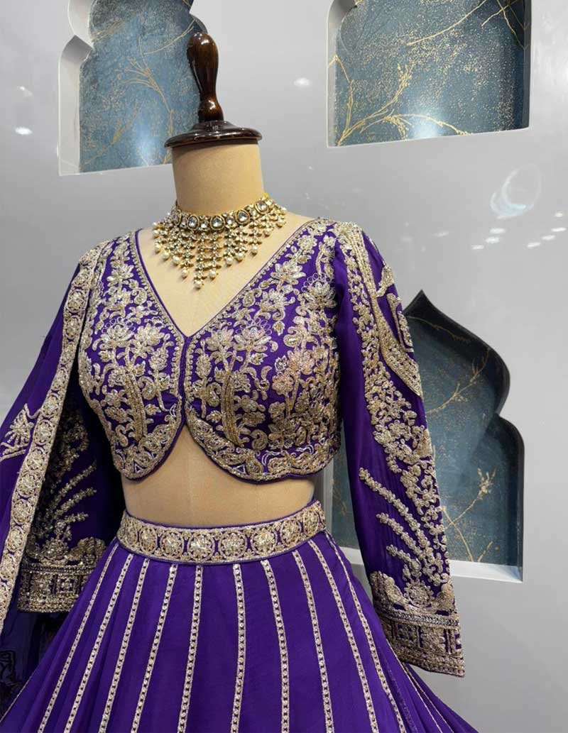 Graceful purple lehenga highlighted with elegant vertical panels and heavy traditional gold embroidery along the hem, creating a majestic flare with timeless appeal.