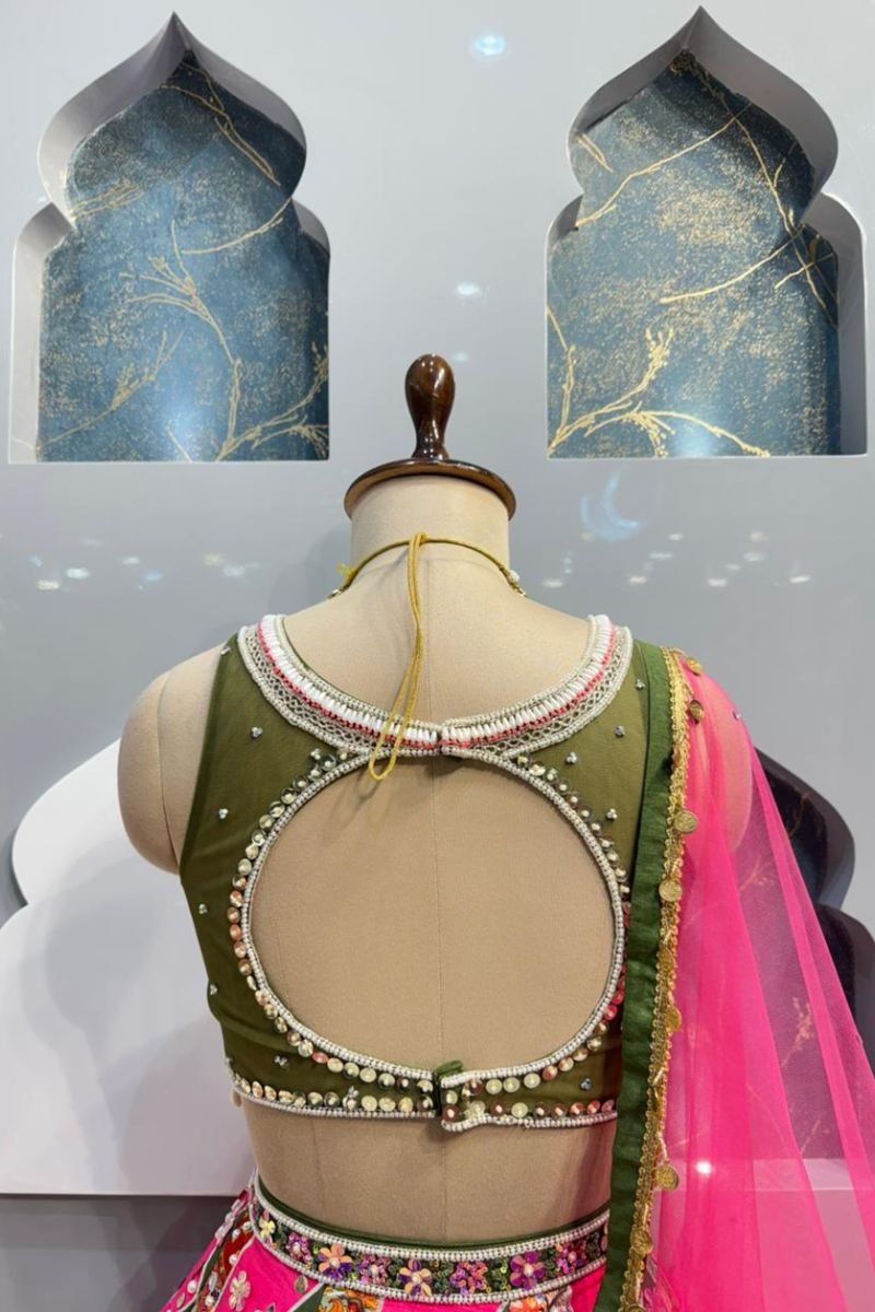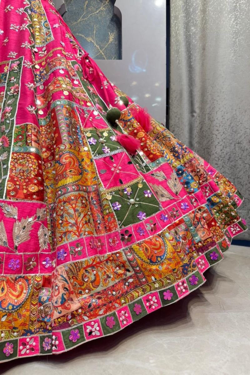 A striking pink lehenga skirt crafted in rich fabric, beautifully highlighted with patchwork-inspired embroidery, mirror embellishments, and vibrant traditional motifs for a grand, flared silhouette.