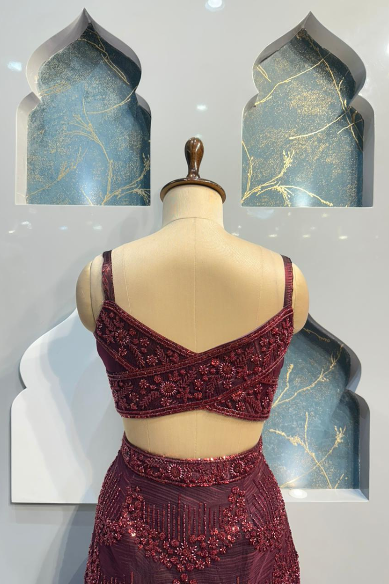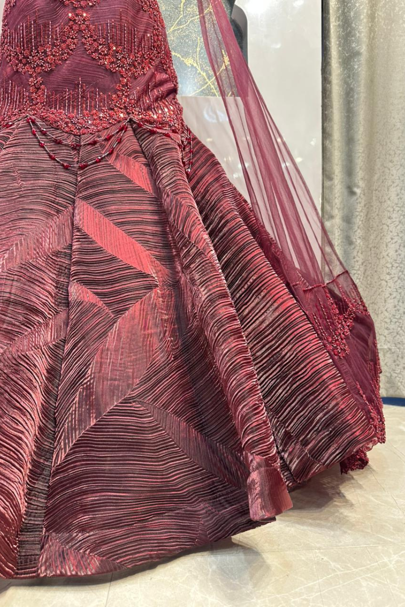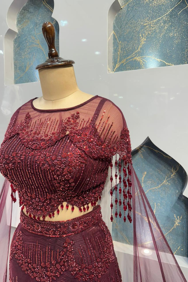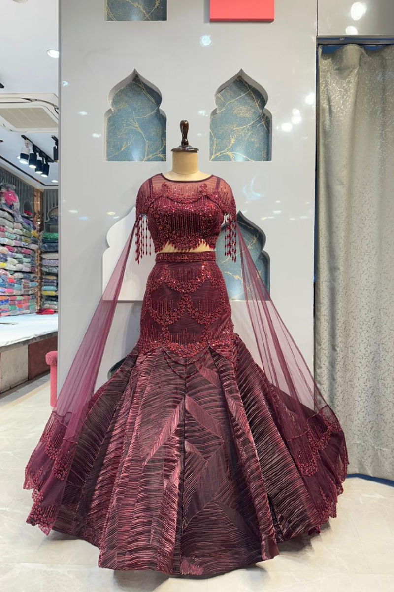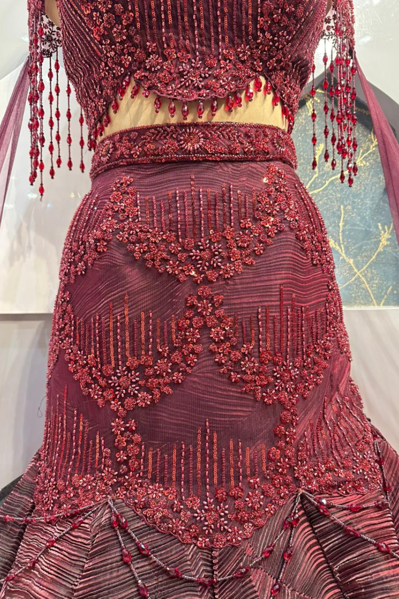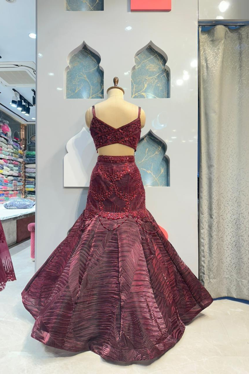 The mermaid skirt features a sculpted fit that flares beautifully towards the hem, creating a dramatic and elegant silhouette. Finished with textured layers and fine detailing, it enhances movement while maintaining a luxurious, refined appeal—ideal for cocktail parties, receptions, and festive celebrations.