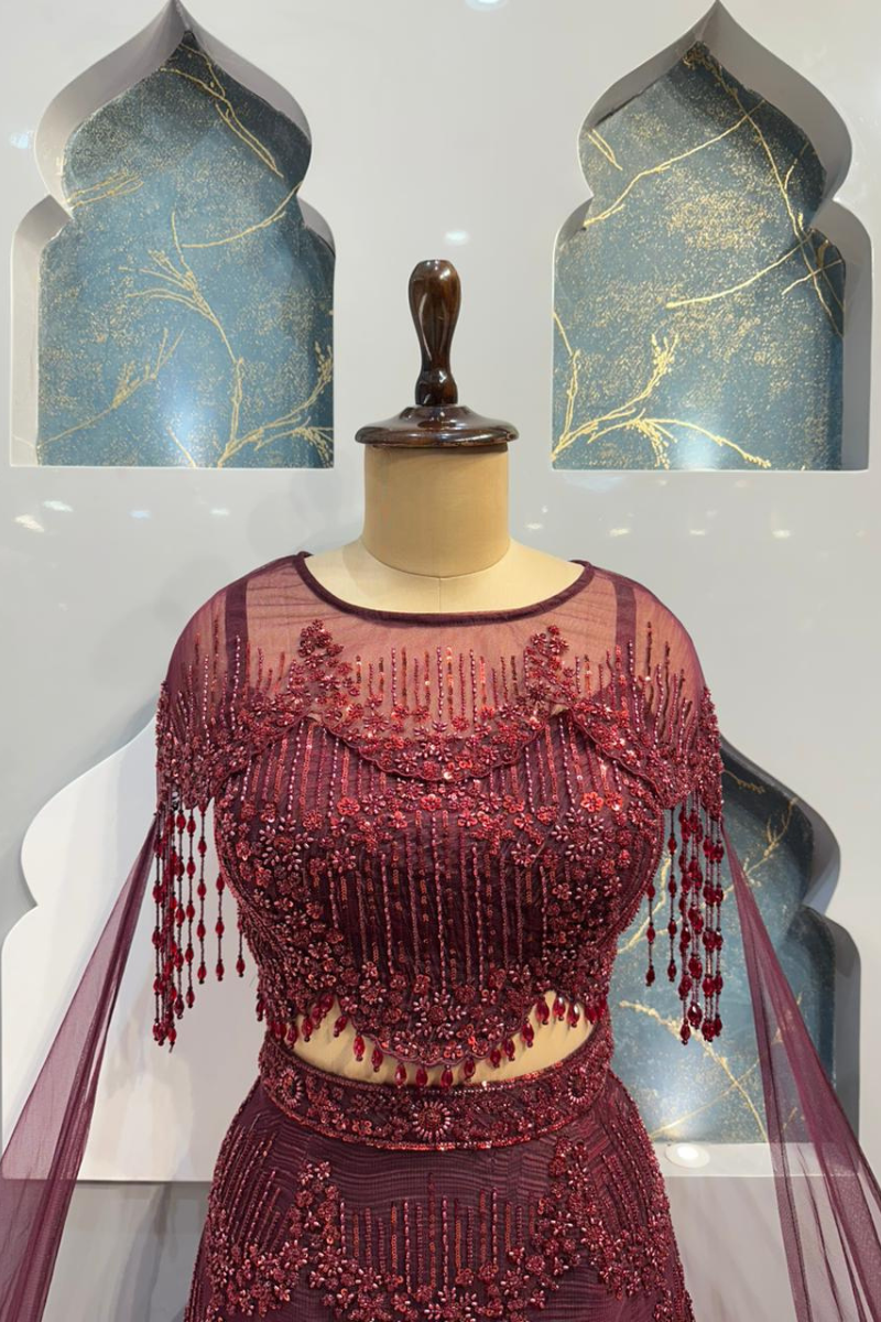 The blouse is intricately crafted with rich embellishments and delicate detailing that create a striking statement look. Designed with a fitted silhouette, it highlights the neckline and adds a touch of glamour, making it perfect for evening events and special occasions.