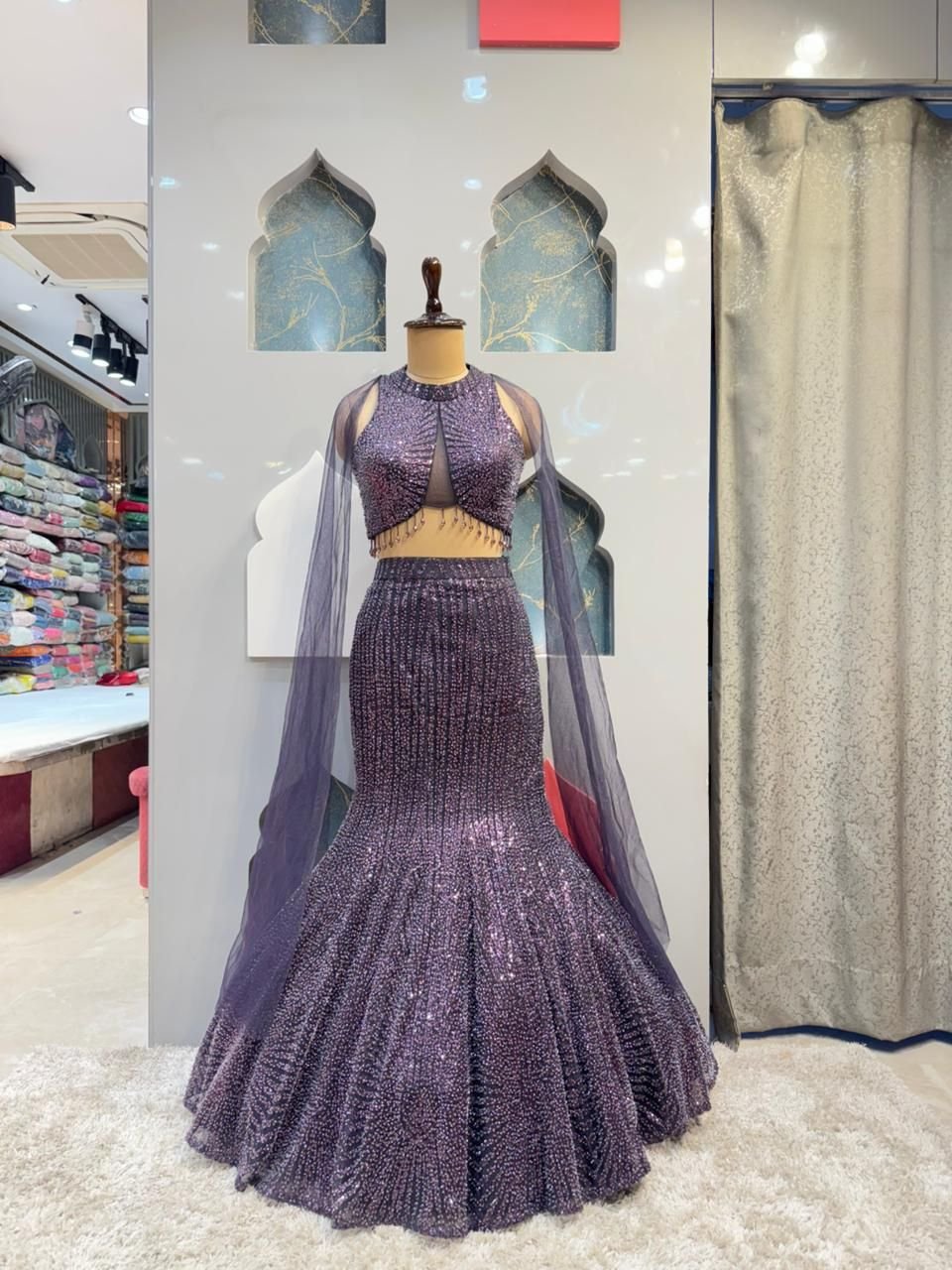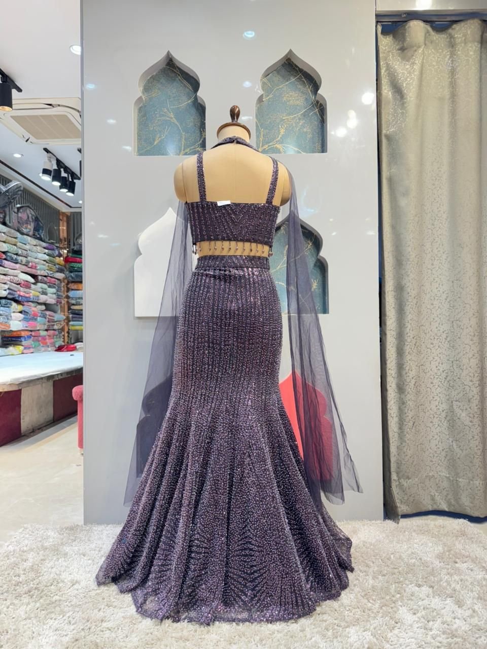 The mermaid-style skirt is tailored to perfection, hugging the body through the waist and hips before flaring out into a dramatic fishtail hem. Fully embellished with fine sequins, it catches the light effortlessly, creating a fluid, glistening effect with every step. The structured flare adds volume and elegance, giving the ensemble a red-carpet-worthy finish.