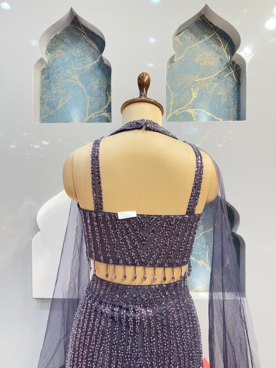 Completing the look is a sheer, lightweight net dupatta styled like a cape, adding a modern, ethereal layer to the outfit. Flowing gracefully from the shoulders, it softens the bold silhouette while enhancing the overall drama with its delicate transparency.