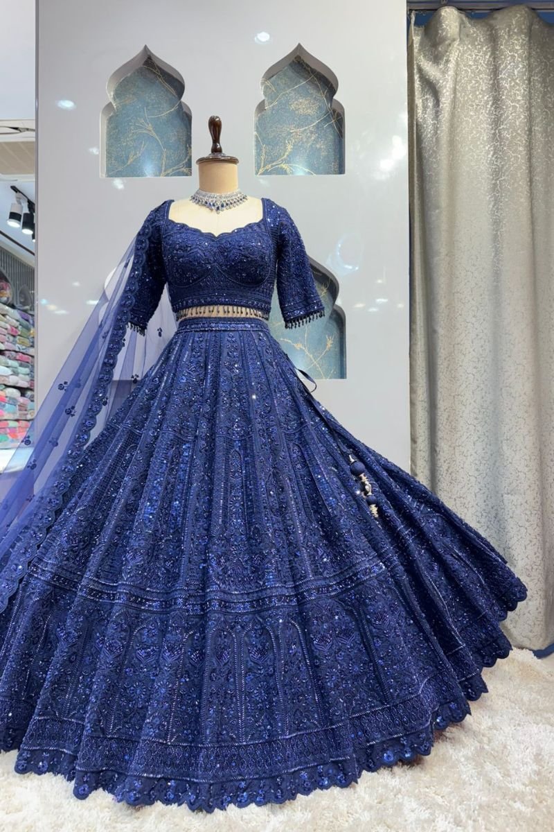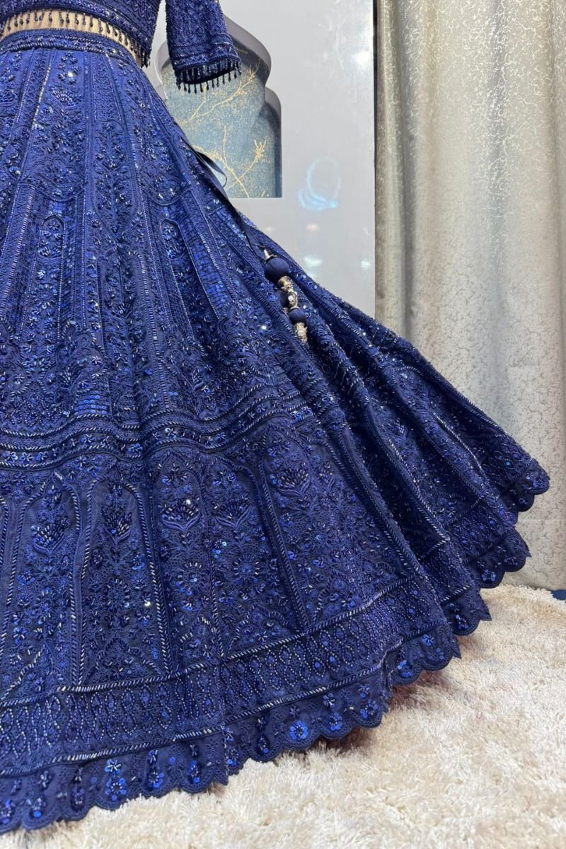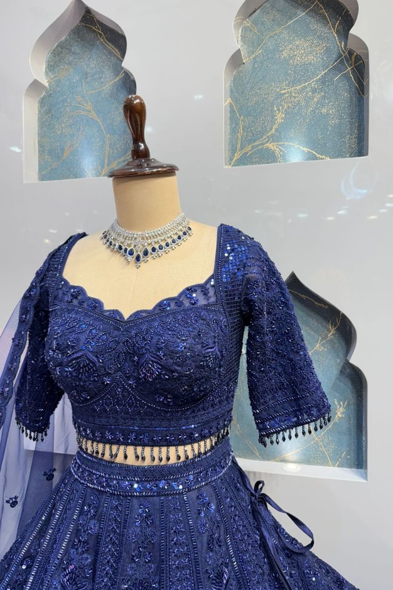 The matching net dupatta is delicately adorned with subtle embroidery and sequin accents, finished with a beautifully scalloped embroidered border. Light and flowy, it adds grace and softness to the richly embellished outfit, completing the royal and sophisticated look perfectly. 💙✨