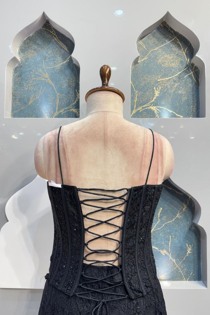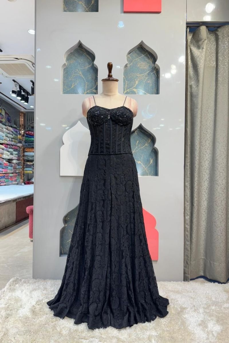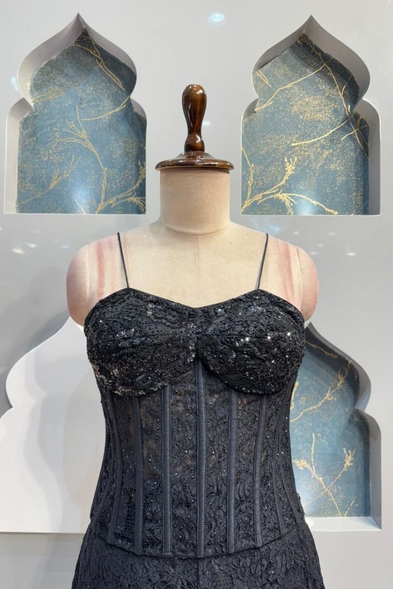 A striking black corset-style top crafted with intricate tonal embroidery and subtle shimmer detailing. Designed with delicate spaghetti straps and a structured silhouette, it beautifully enhances the waist while offering a bold, contemporary Indo-Western appeal. The finely embellished bust and panelled construction add elegance and definition, making it perfect for evening wear.
