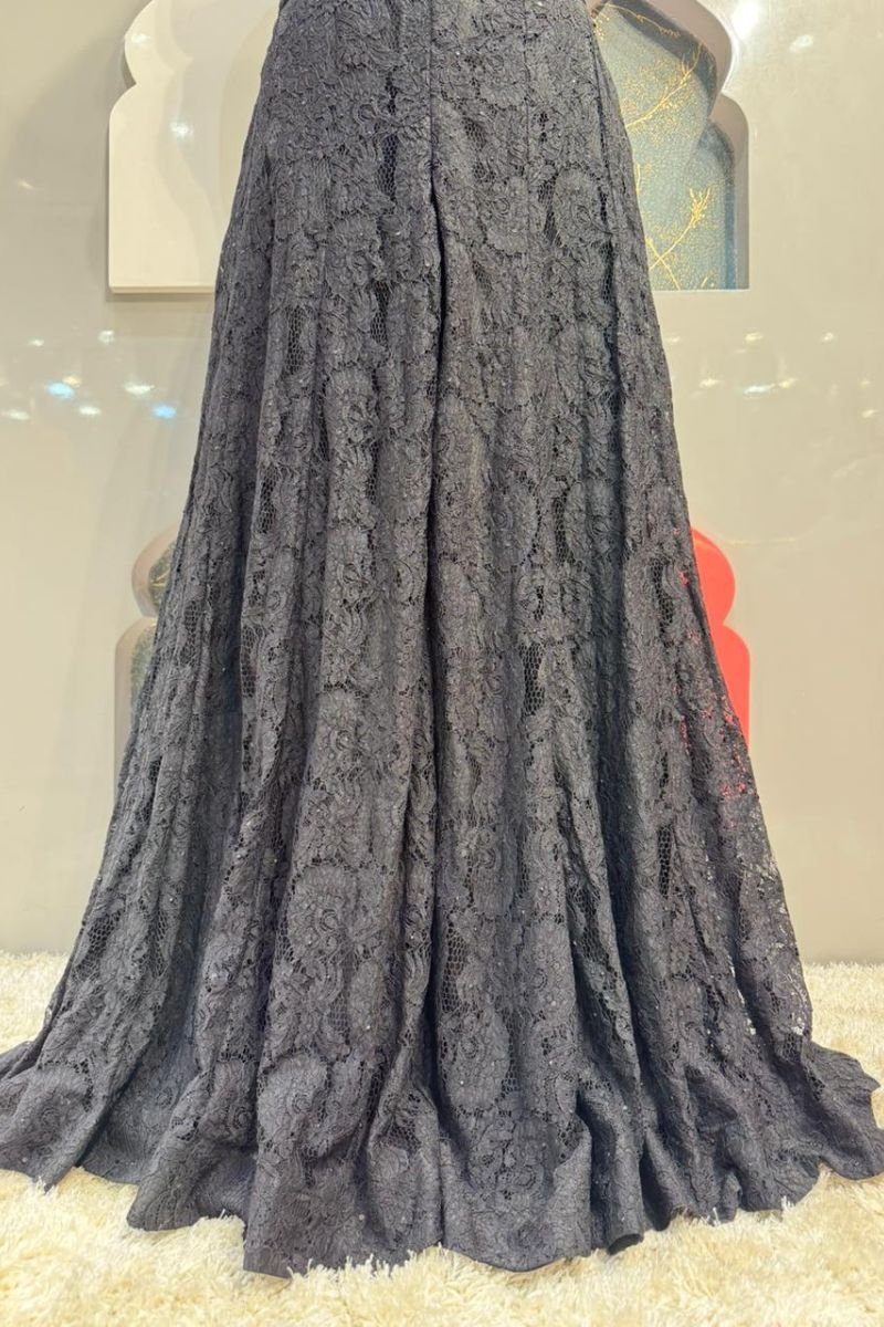 The divider skirt features a graceful flared silhouette in matching black, adorned with textured embroidery that adds depth and richness. Flowing effortlessly with every movement, it balances the structured top perfectly, creating a sophisticated and modern fusion look ideal for parties, cocktail events, and festive occasions.