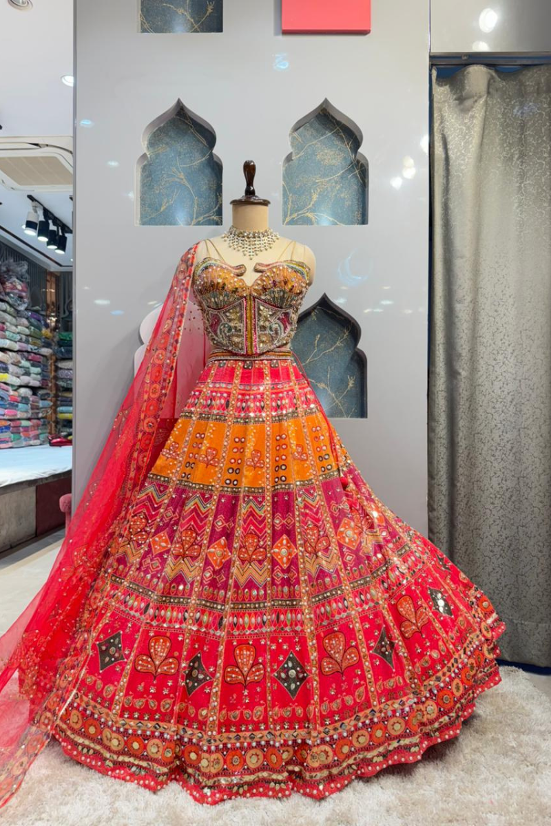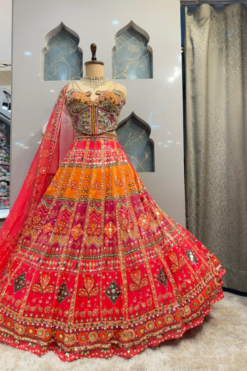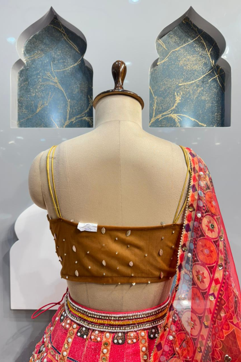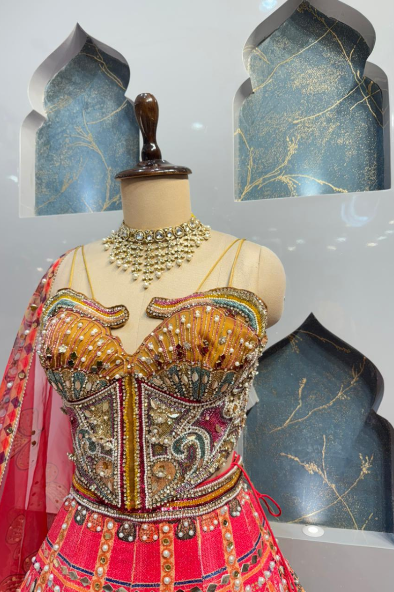 The blouse features a structured, corset-style design with intricate embroidery and detailed embellishments that highlight the bodice beautifully. The rich craftsmanship and fitted silhouette enhance the waist, giving it a bold yet elegant appeal. The combination of warm tones and ornate detailing makes it perfect for mehendi, sangeet, or festive celebrations.