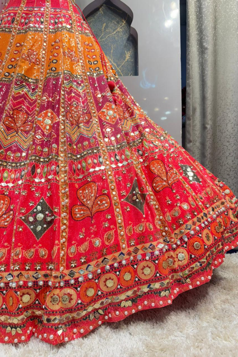 The lehenga is designed in a stunning mix of pink and mustard hues, adorned with traditional motifs and intricate pattern work. The wide flare adds grandeur and movement, creating a graceful twirl effect. The detailed borders and vibrant color blocking give it a lively, celebratory charm while maintaining a royal finish.