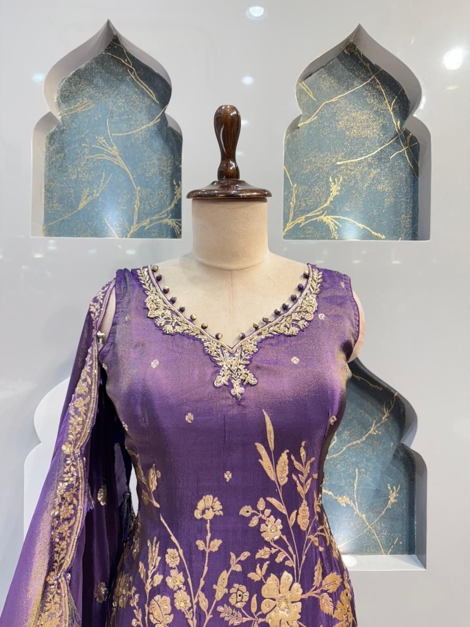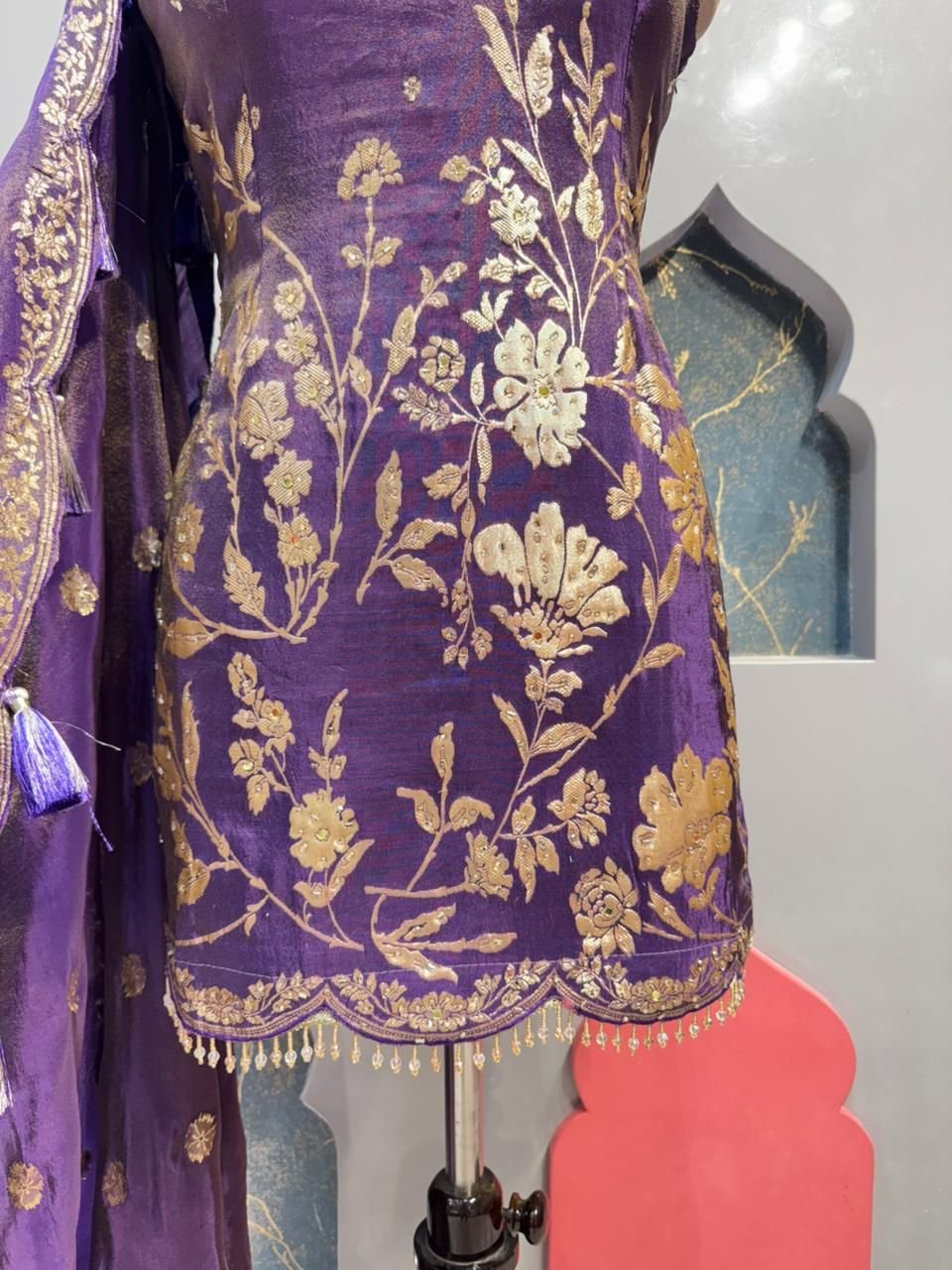 The beautifully tailored kurta features a deep purple base adorned with intricate gold zari floral weaving that adds a luxurious and traditional touch. The neckline is delicately embellished with fine detailing, enhancing its graceful appeal. The fitted silhouette highlights the structure, while the hemline is finished with elegant borders for a refined finish.
