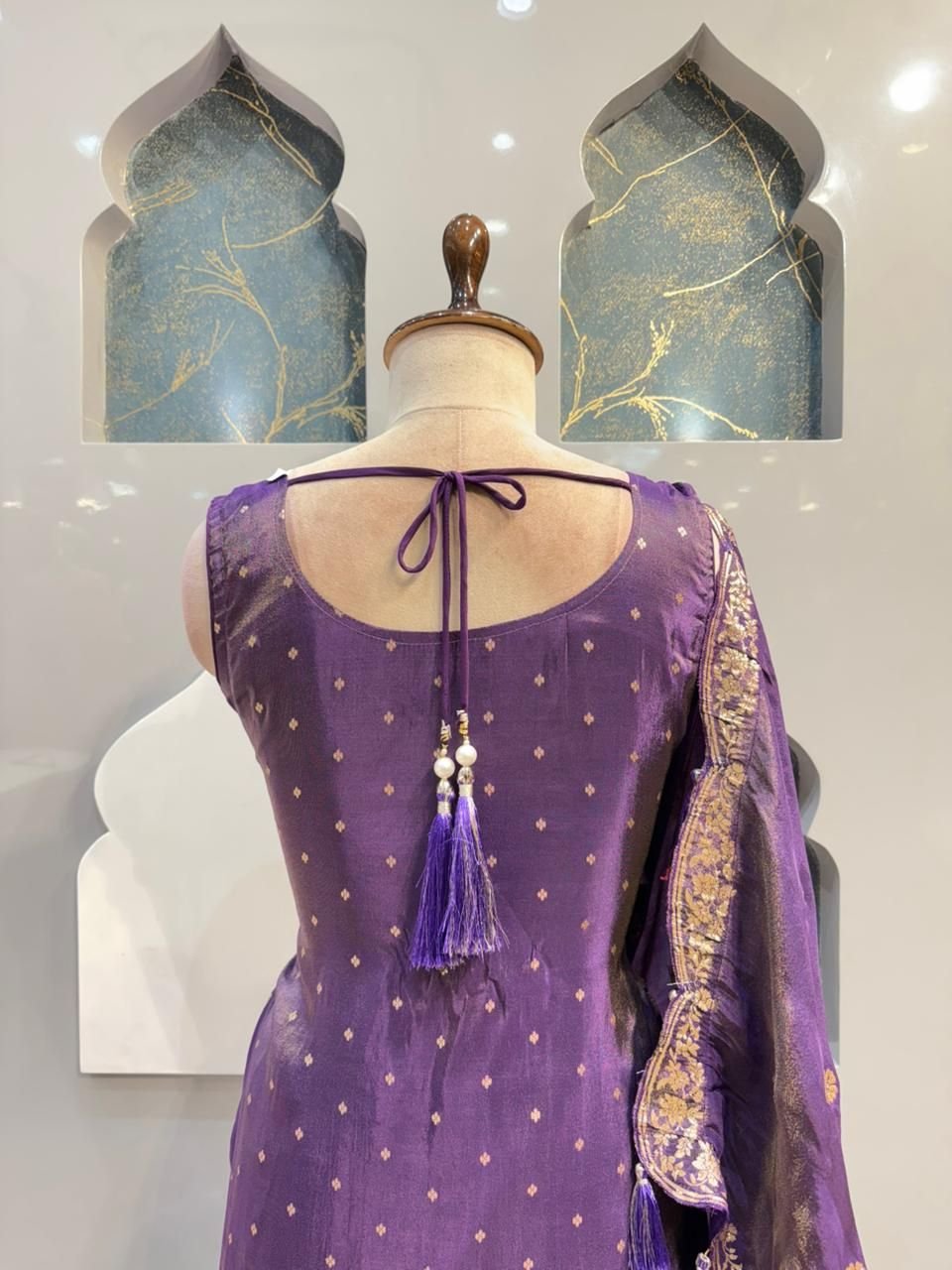 Completing the look is a coordinated purple dupatta, accentuated with delicate gold motifs and a finely detailed border. Tassel accents along the edges add a playful yet sophisticated charm, making it perfect for graceful draping.