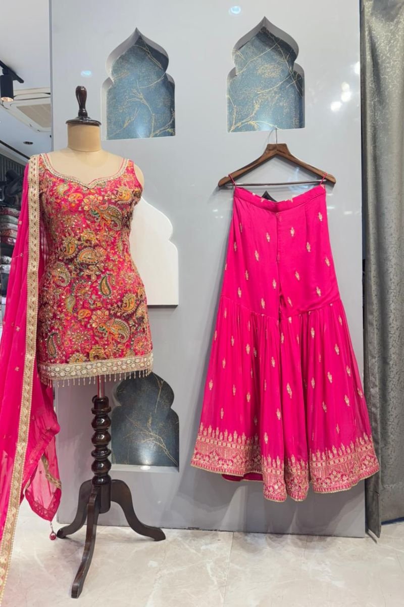 Bright pink sharara with a wide flare, delicate gold motifs, and a richly embroidered hem.