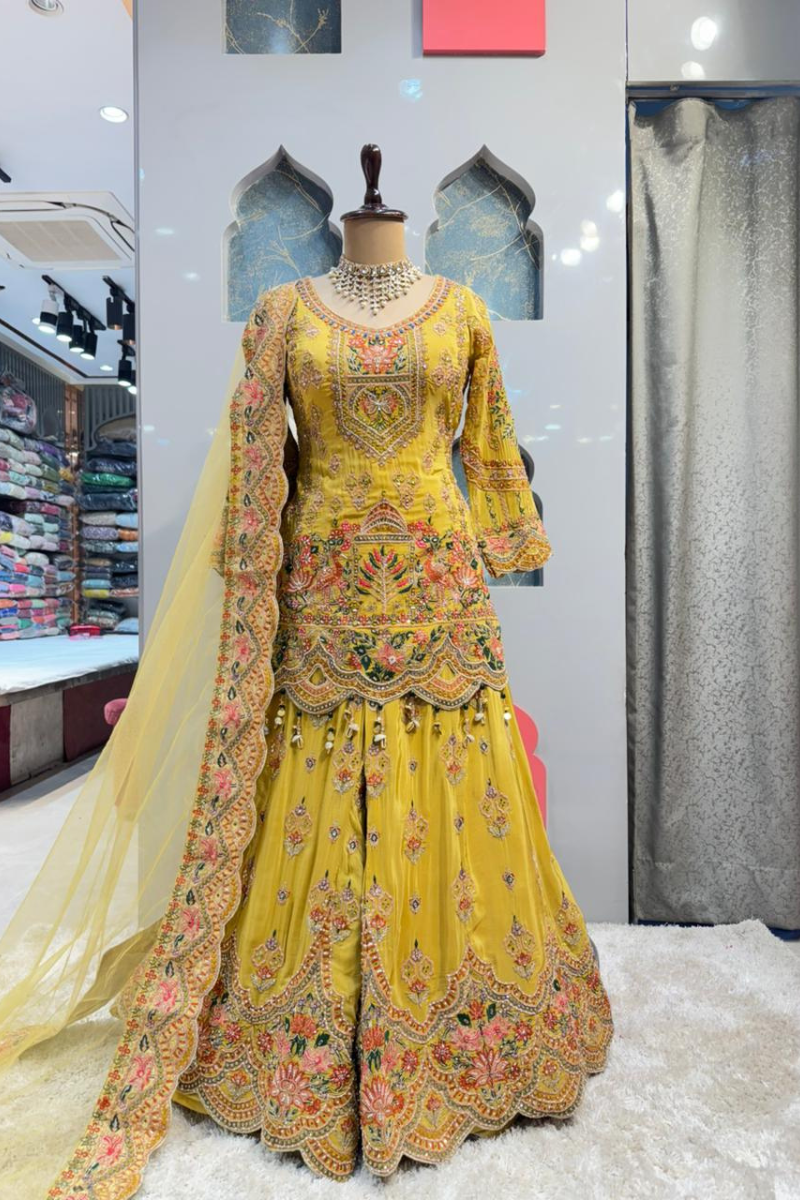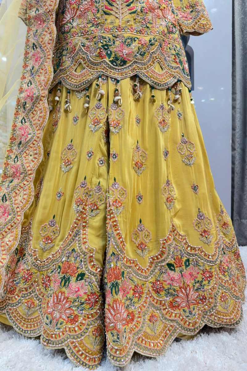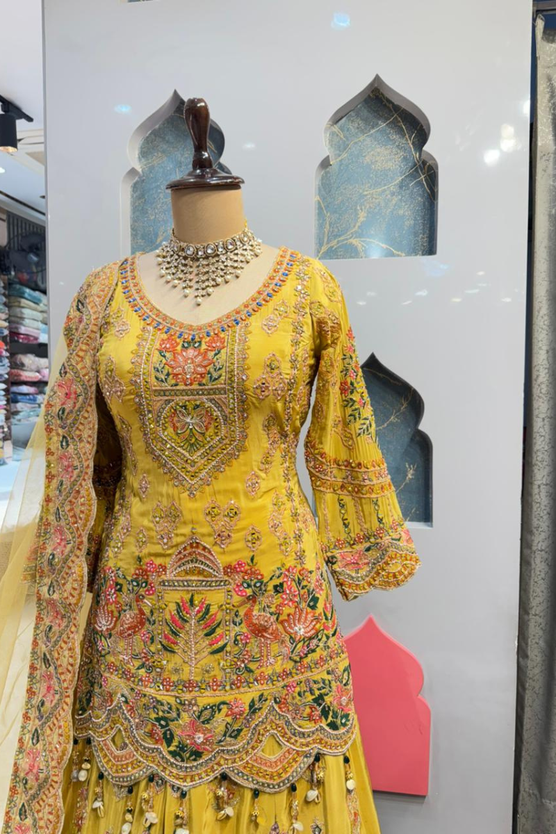 The sheer yellow dupatta is finished with delicate embroidery and subtle accents, adding a soft, elegant layer that beautifully balances the richness of the ensemble.