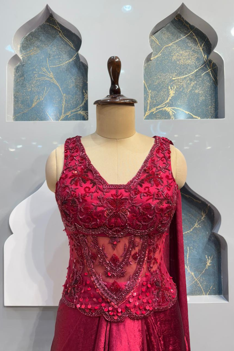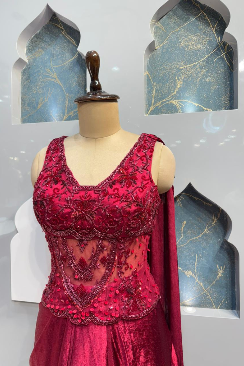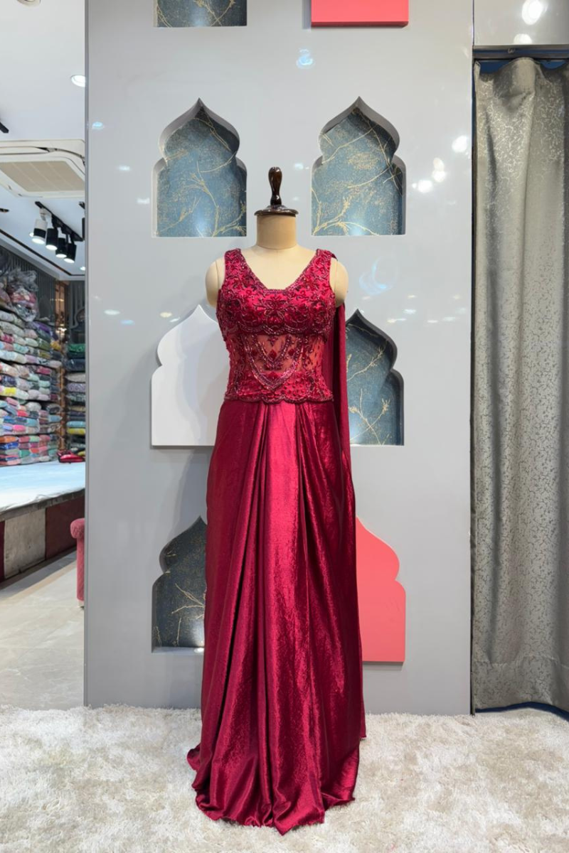 The skirt flows gracefully with soft draping that creates a flattering, elongated look. Made in a smooth, lustrous fabric, it falls effortlessly to the floor, giving a gown-like elegance. The subtle sheen of the wine hue adds sophistication, making it ideal for cocktail parties, weddings, or festive celebrations.
