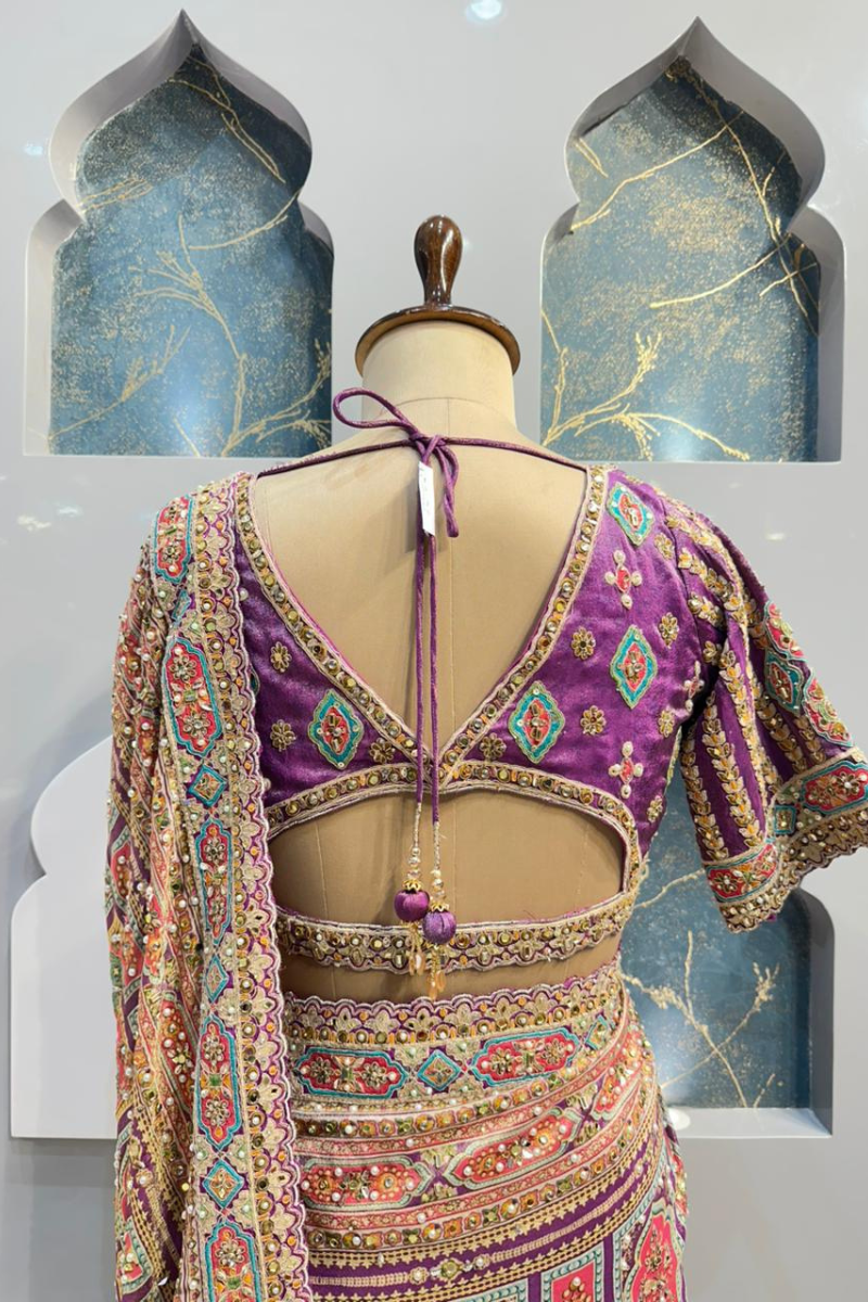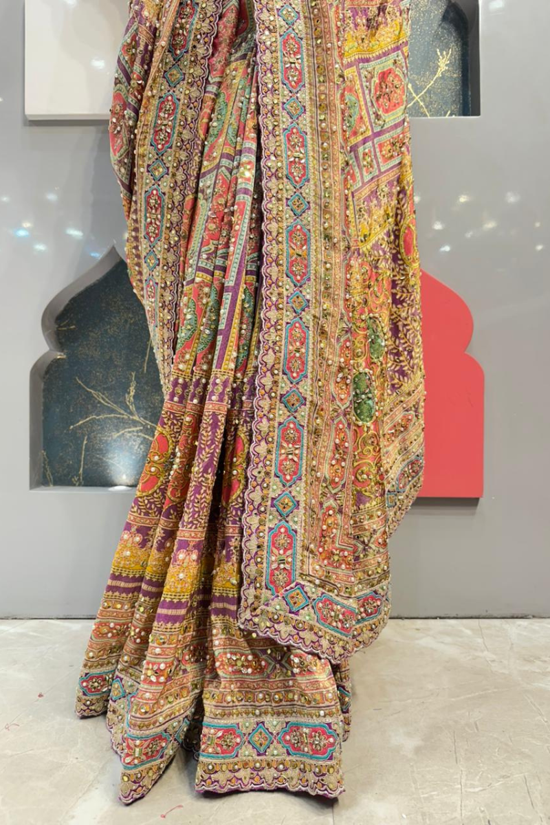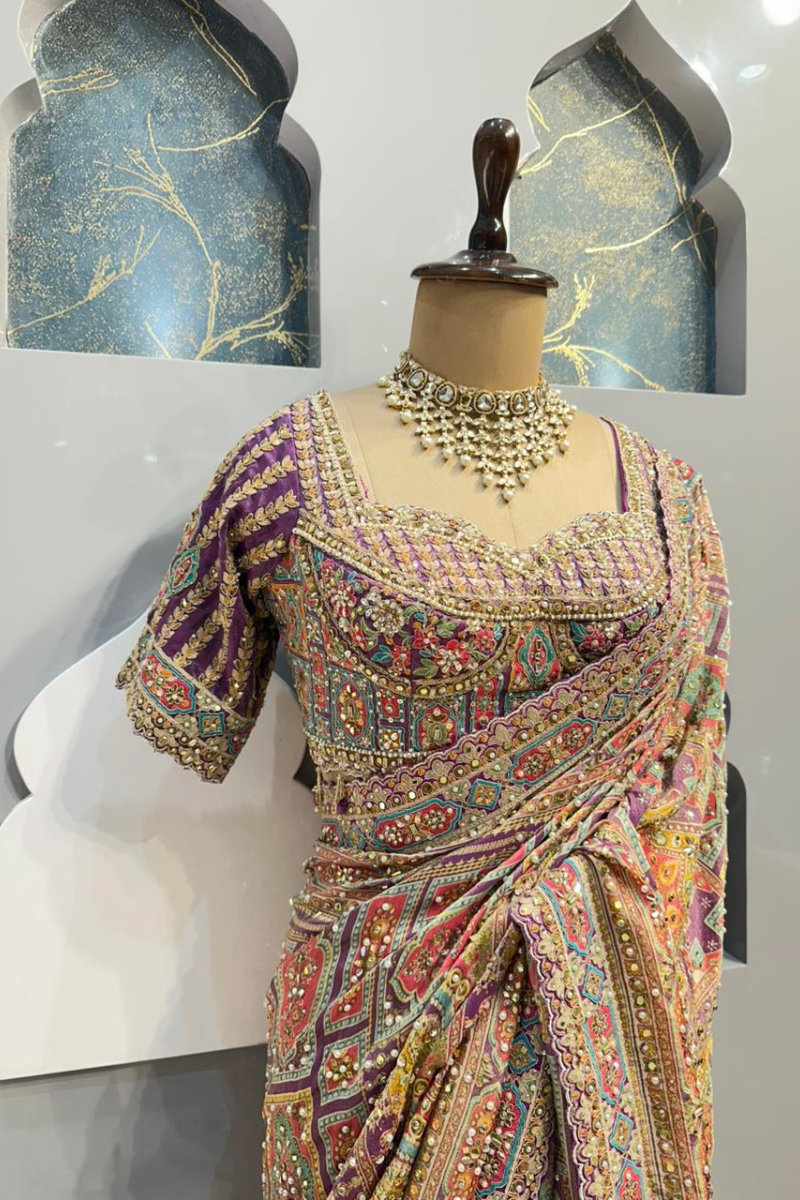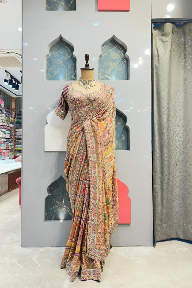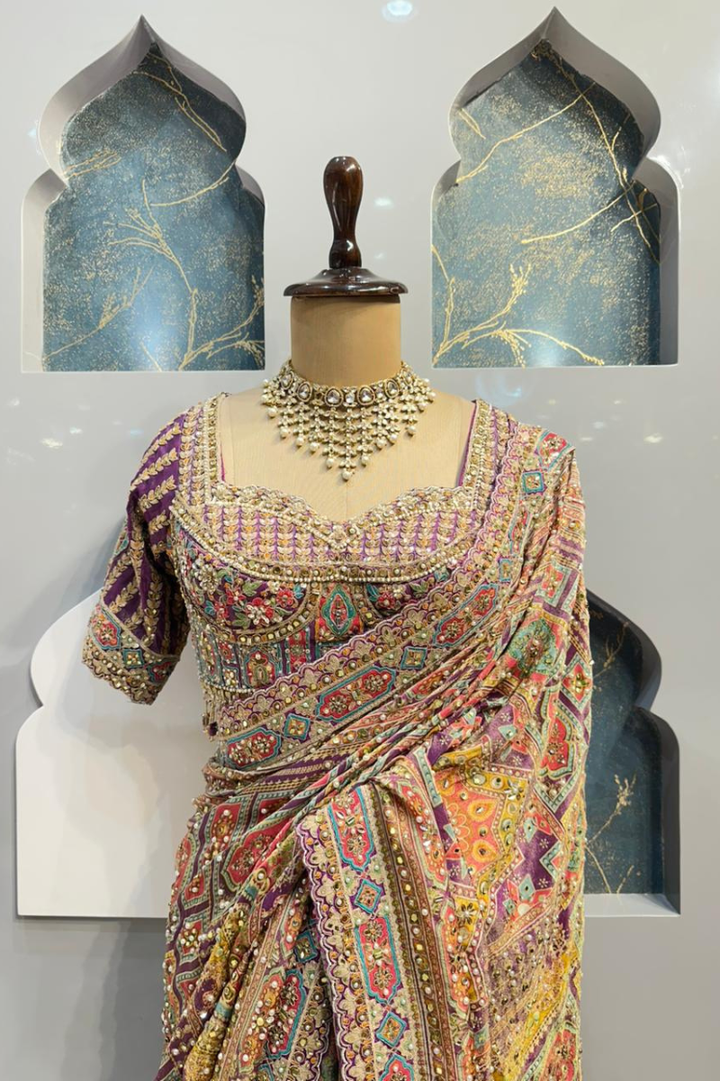 The blouse is designed with refined detailing and a flattering silhouette that enhances the overall elegance of the saree. Crafted to complement the embellishments, it offers a graceful balance of comfort and sophistication, making it suitable for festive and occasion wear.